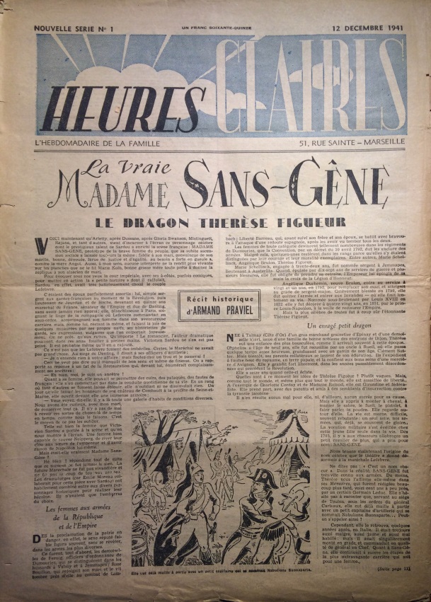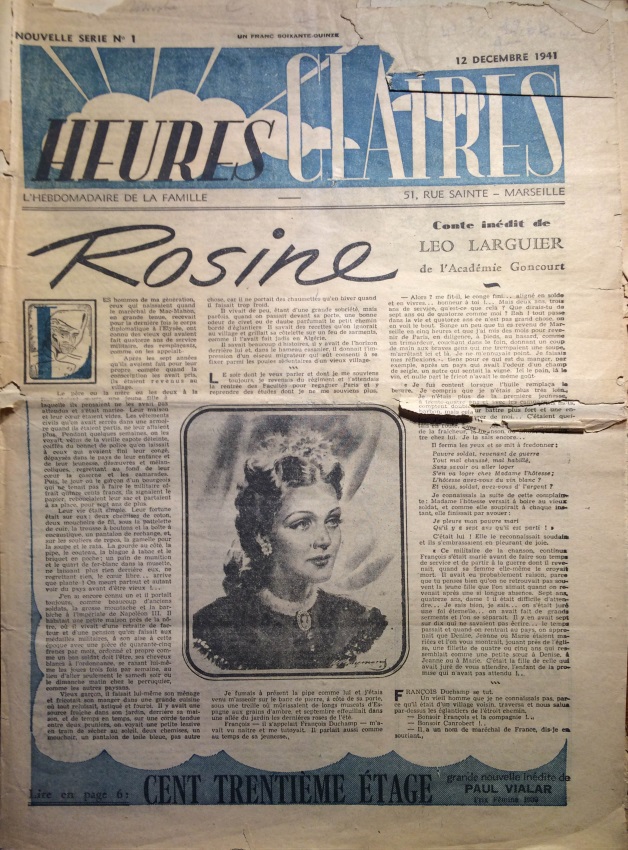 Une nouvelle série appelée Heures Claires, de parution hebdomadaire cette fois, voit le jour en décembre 1941. Cette revue de 12 pages grand format 30 sur 42 cms, sous-titrée l’hebdomadaire de la semaine, fait paraitre son n°1 le 12 décembre 1941. Les bureaux sont en zone libre à Marseille, 51, rue Sainte. et E. Fournier en est le Directeur-Gérant.