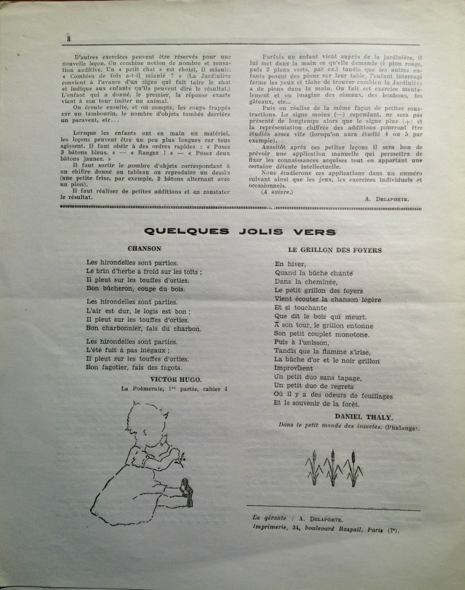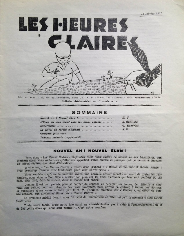 Une première série dénommée « Les Heures Claires » ,de parution bi-trimestrielle, focalisée sur l’éducation des tout-petits au J.E. et dans la famille, a démarré avec le n°1 daté du 15 janvier 1937. Les bureaux de cette revue de format 22,5 X 28 cms sont situés 56, rue du Docteur Blanche à Paris avec comme gérante A. Delaporte.
