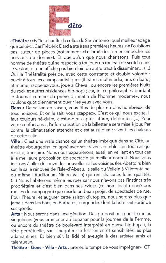 L’éditorial débute par un hommage à Frédéric Dard, homme de théâtre.