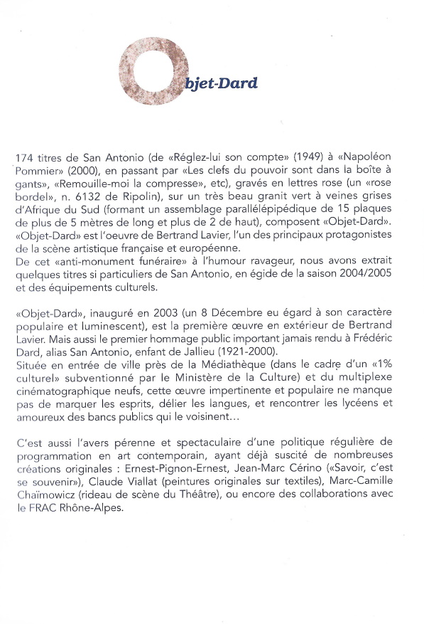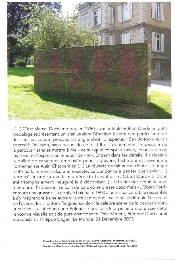 La couverture est un titre de Frédéric Dard dit San-Antonio d’après le monument « Objet-Dard » de Bertrand Lavier inauguré le 8 décembre 2003.