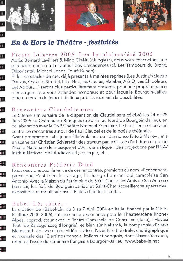 Ce document rassemble les événements de la saison culturelle 2004-2005 de la ville de Bourgoin-Jallieu au Théâtre Jean-Vilar, au Conservatoire National de Musique & d’Art dramatique, aux Abattoirs, à la Médiathèque et au Musée.