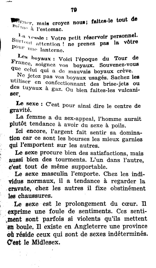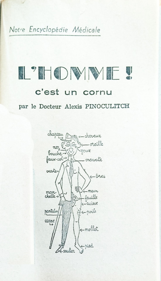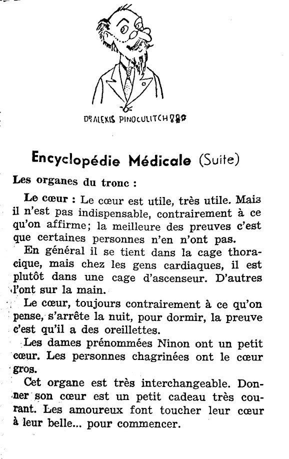 On trouve aussi dans cette revue la 2ème partie d’une rubrique intitulée Notre Encyclopédie Médicale dans laquelle on découvre un texte humoristique sur les organes du tronc humain qui a pour titre « L’homme ! c’est un cornu » rédigée par le docteur Alexis Pinoculitch. La 1ère partie de cette encyclopédie a paru dans le Cent Blagues n°9.