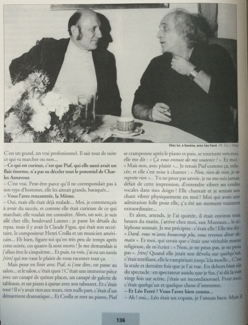 – Edith Piaf chez qui il avait été invité boulevard Lannes à une époque où elle était déjà malade et qu’il a soutenue physiquement pour qu’elle puisse chanter » Non, rien de rien, je ne regrette rien »