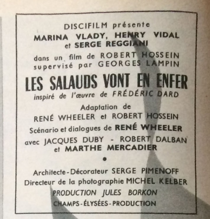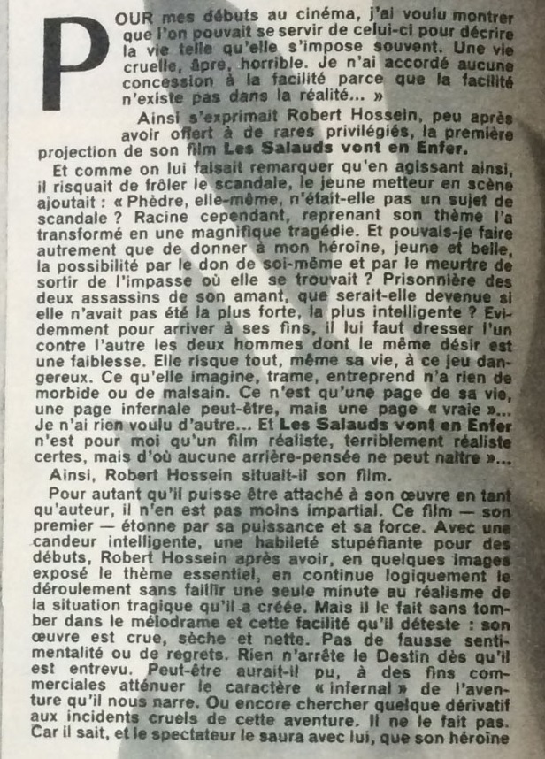 Ce numéro contient un article sur Robert Hossein ainsi que le scénario détaillé avec photos du film Les salauds vont en enfer qu’il vient de réaliser d’après la pièce de théâtre éponyme de Frédéric Dard.