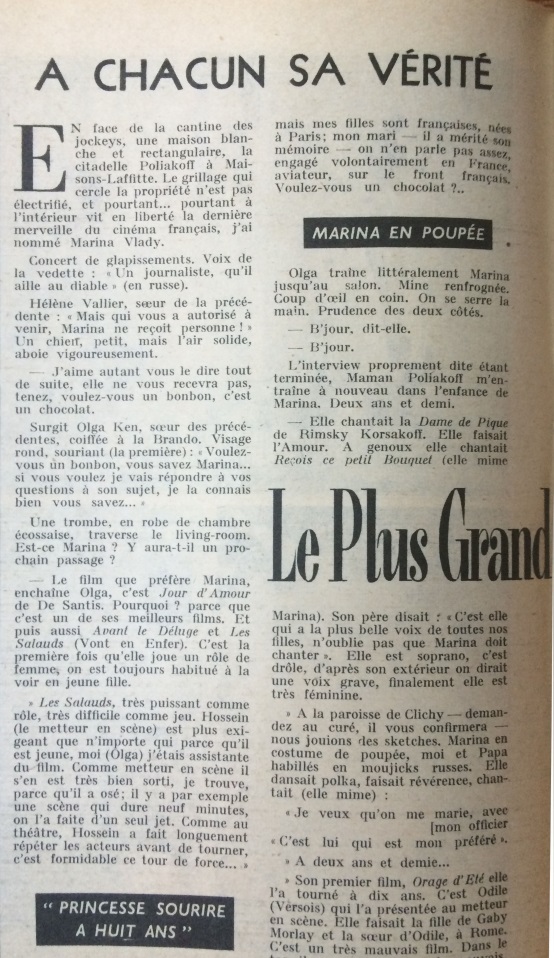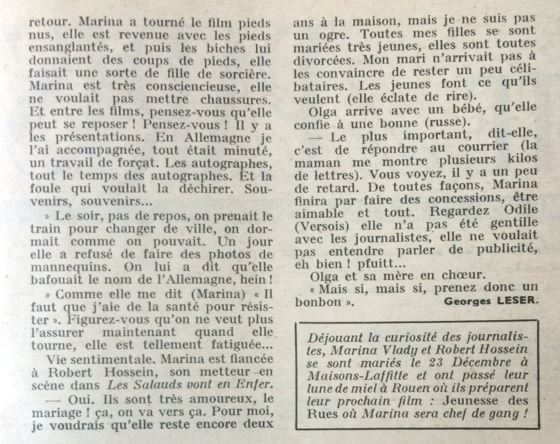 Ce numéro contient  un article de Georges Leser sur Marina Vlady qui rappelle la difficulté de tournage du  film  Les salauds vont en enfer réalisé par son mari Robert Hossein d’après la pièce de théâtre éponyme de Frédéric Dard.