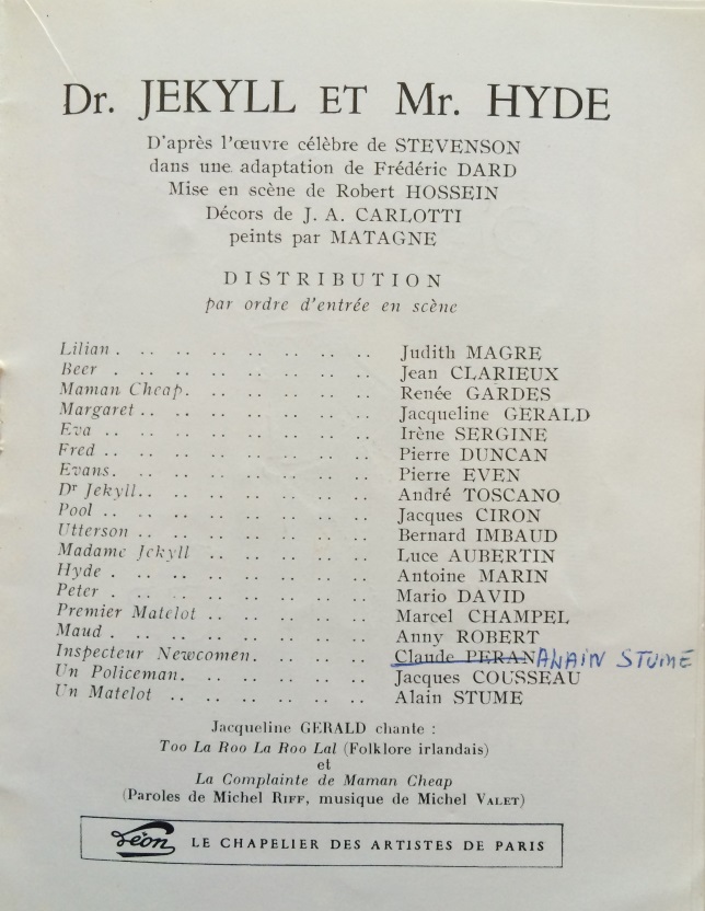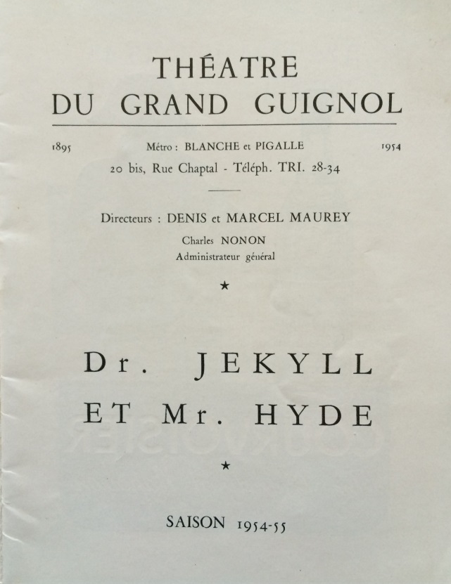 Programme de théâtre du Grand Guignol saison 1954-55 avec la pièce Dr. Jekyll et Mr. Hyde, adaptée par Frédéric Dard et mise en scène par Robert Hossein dans des décors de J.A. Carlotti, d’après l’oeuvre célèbre de Stevenson.