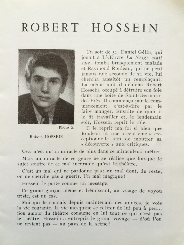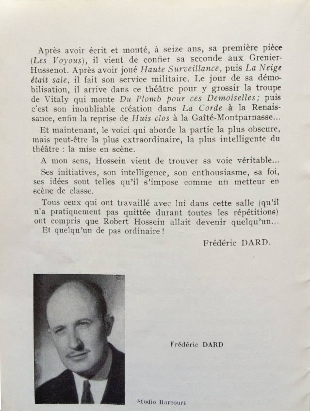 On trouve dans ce programme un texte de Frédéric Dard qui met en valeur Robert Hossein, texte illustré par une photo de chacun.