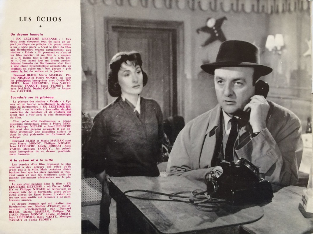 Dossier de 8 pages de format 31 sur 23 cm pour le film En légitime défense réalisé par André Berthomieu et dont les dialogues ont été écrits par Frédéric Dard.