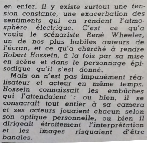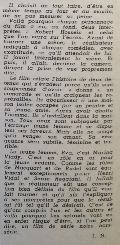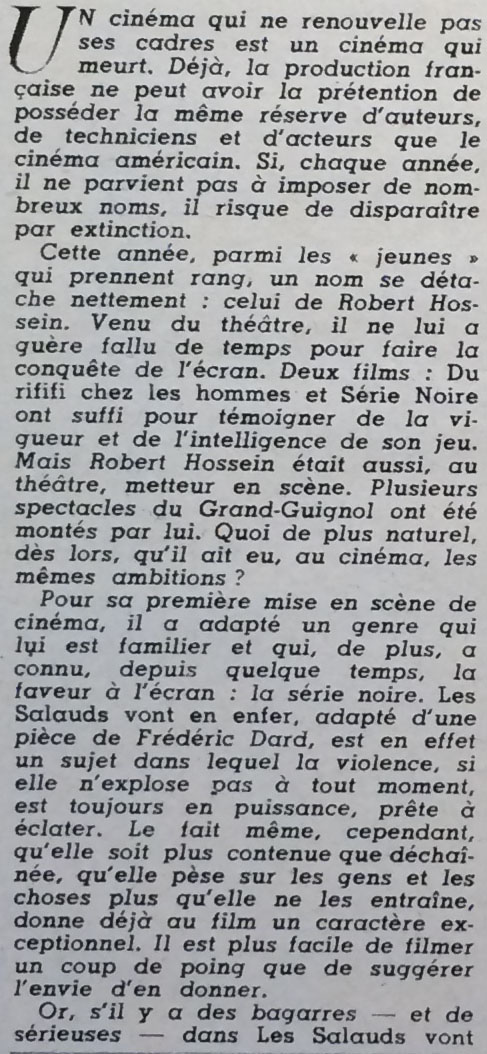 Ce numéro dont la première de couverture est consacrée à l’étoile de l’année, Marina Vlady, contient un article sur les débuts de Robert Hossein en tant que réalisateur au cinéma pour le film Les salauds vont en enfer, tiré de la pièce de théâtre éponyme de Frédéric Dard.