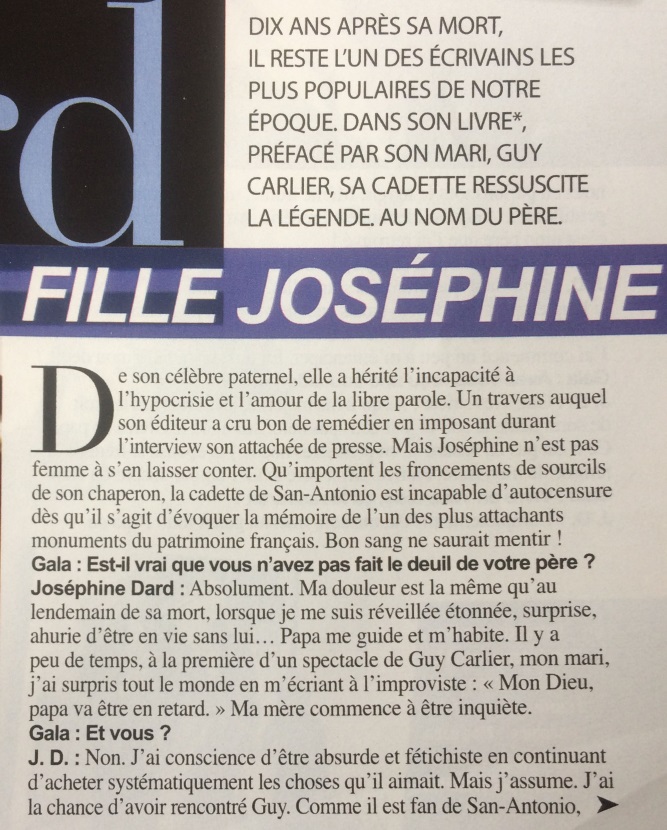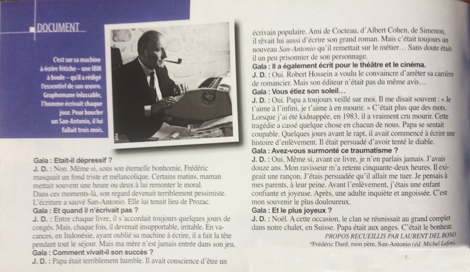 Ce numéro contient une interview de Joséphine Dard réalisée par Laurent del Bono. Elle s’exprime sur son père à l’occasion de la sortie de son livre Frédéric Dard, mon père, San-Antonio.
