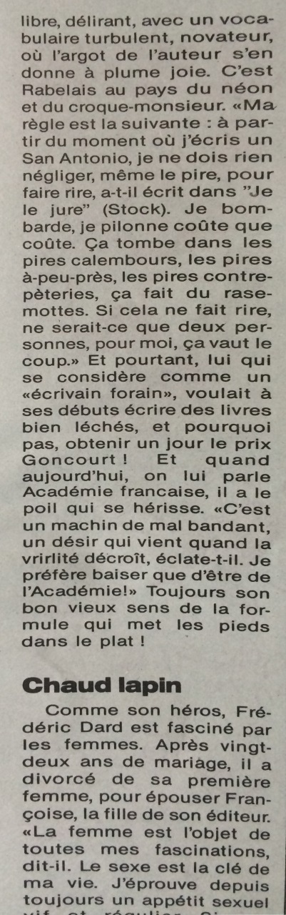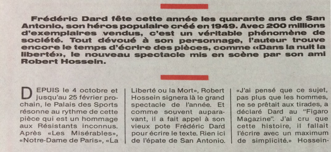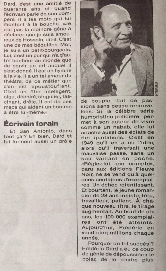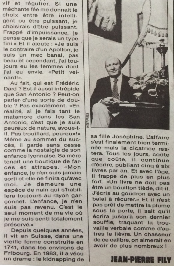Ce numéro dont la première de couverture est consacrée à Frédéric Dard et aux 40 ans de San-Antonio contient un article de Jean-Pierre Fily qui rappelle brièvement la vie de Frédéric Dard, son amitié avec Robert Hossein, son 2ème mariage et Joséphine et bien sur le succès phénoménal des San-Antonio.