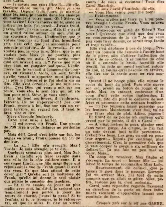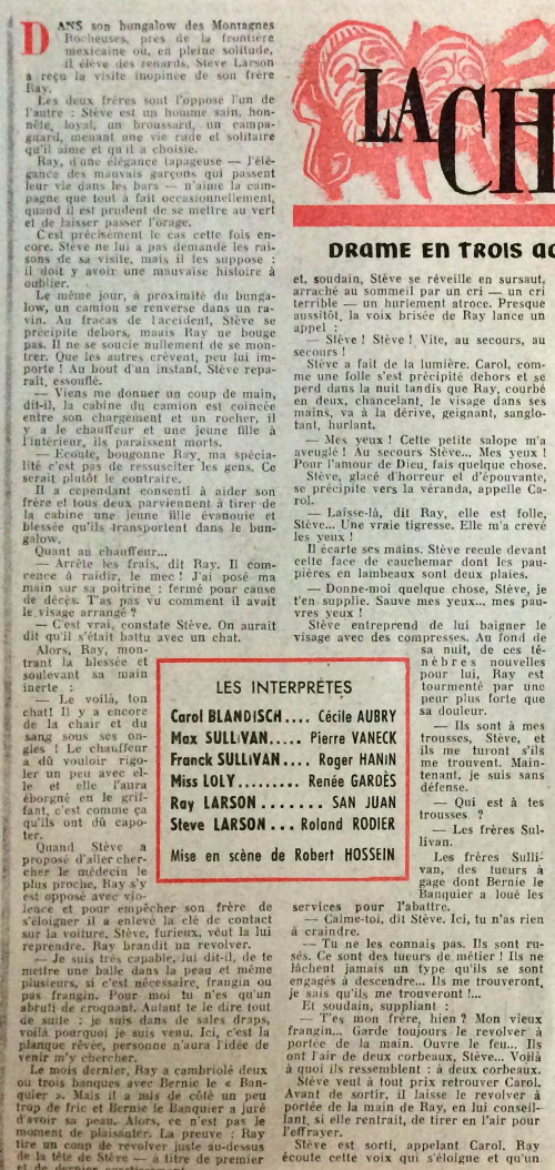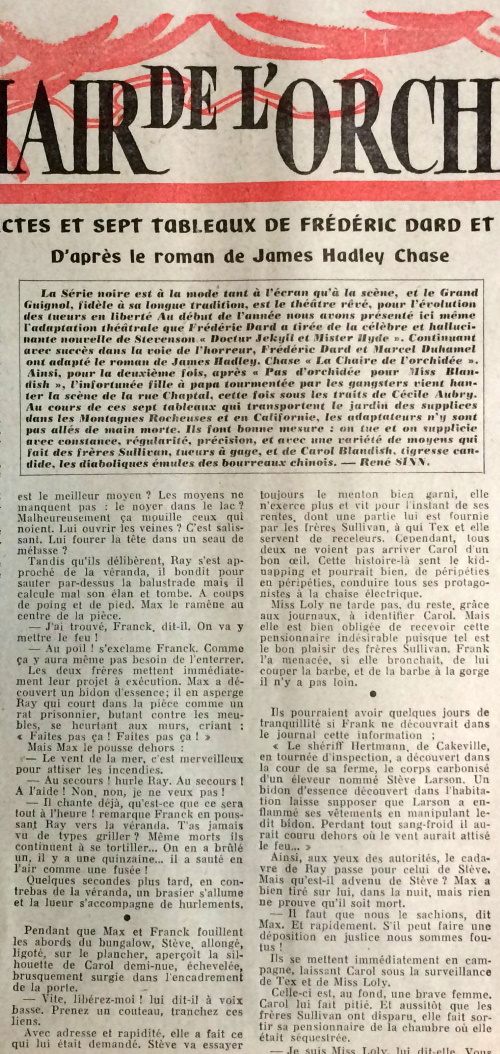 On trouve dans ce numéro un texte de René Sinn racontant la pièce de théâtre La Chair de l’orchidée écrite par Frédéric Dard et Marcel Duhamel et mise en scène par Robert Hossein.