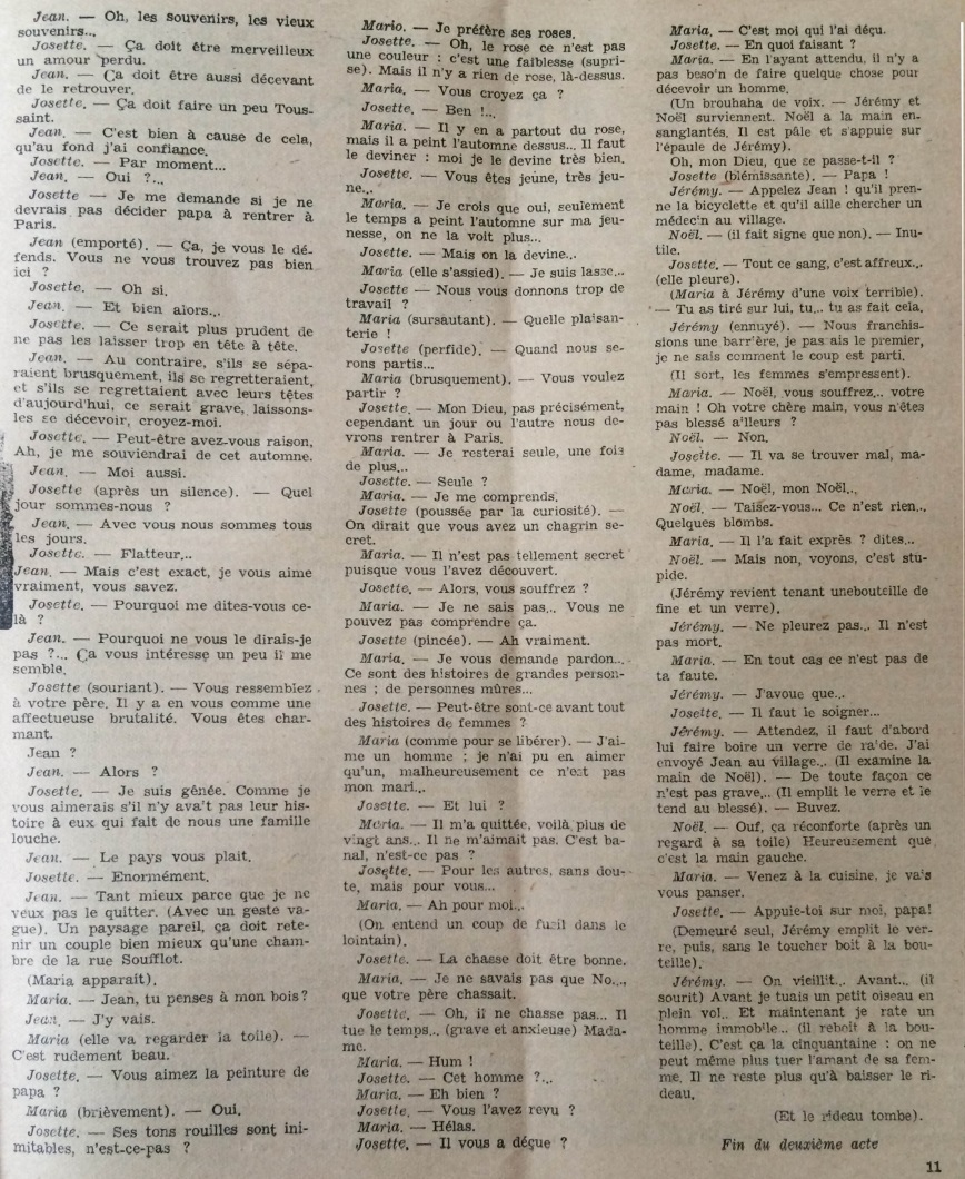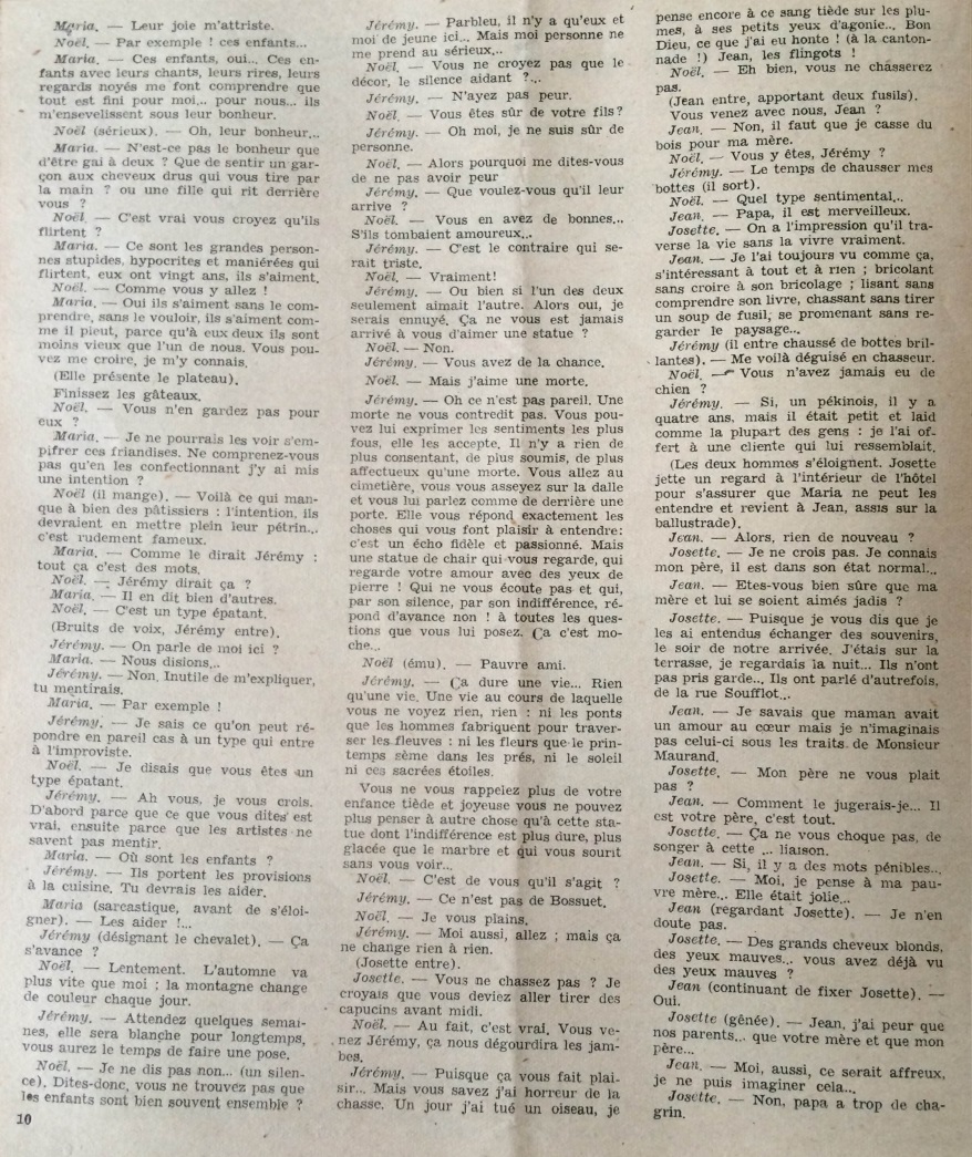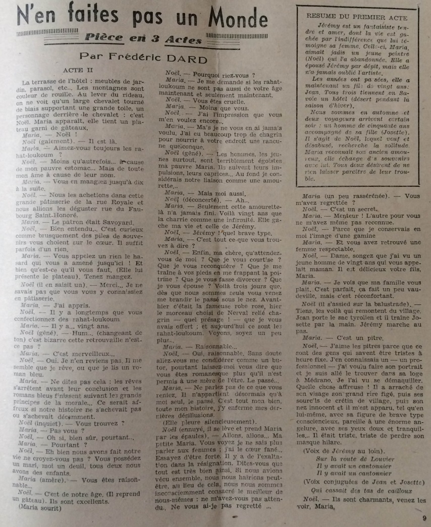 Ce numéro contient aussi le texte de l’acte II d’une pièce de théâtre en 3 actes écrite par Frédéric Dard et intitulée « N’en faites pas un Monde ». Cette pièce radiophonique a été diffusée sur Radio-Lyon le 5 juin 1948. Cette pièce, à ma connaissance n’a jamais été créée au Théâtre.