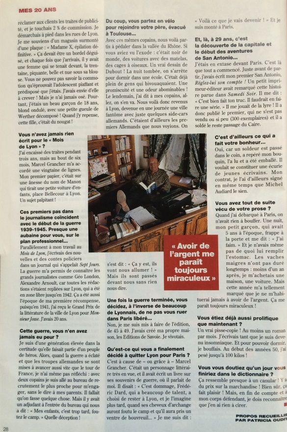 Puis la montée sur Paris à 28 ans et la mention d’une histoire policière « Réglez-lui son compte » parue dans le journal Samedi-Soir et qui a conduit au 1er San-Antonio publié chez Jacquier.