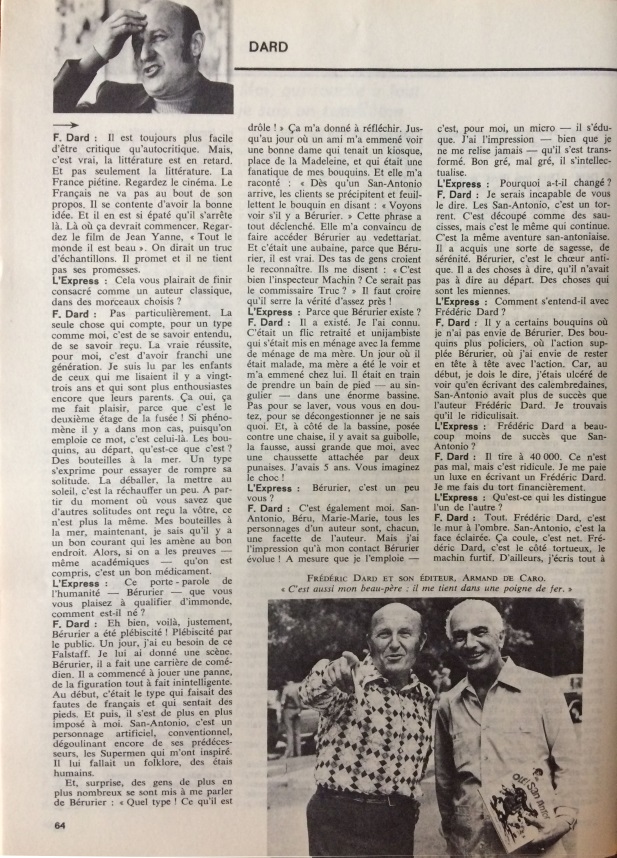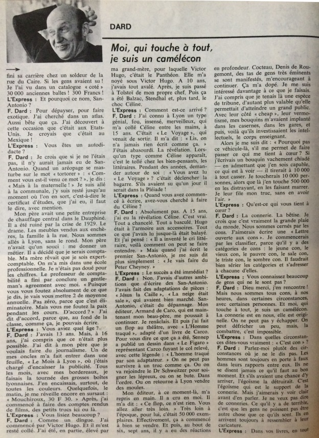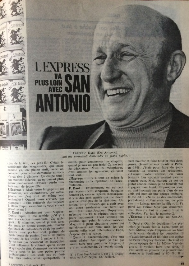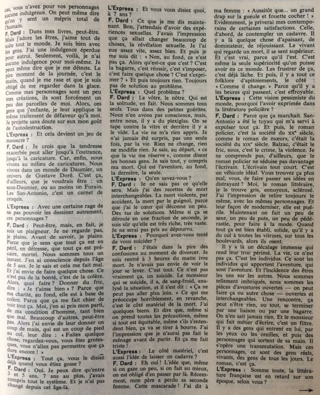 – « San-Antonio a été le tuyau qui m’a servi à expulser tout ça. La seule chose qui compte, pour un type comme moi, c’est de se savoir entendu, de se savoir reçu. Je suis lu par les enfants de ceux qui me lisaient il y a 23 ans et qui sont plus enthousiastes encore que leurs parents; ça oui, ça me fait plaisir ».