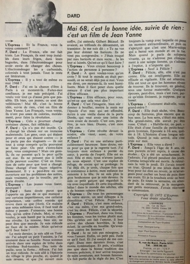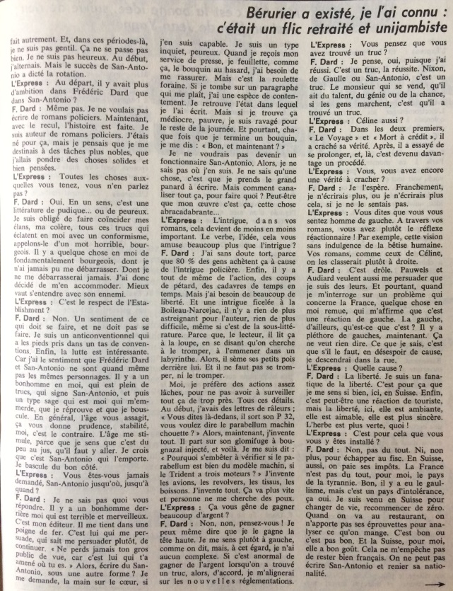 Ce numéro contient un long entretien de 7 pages de Frédéric Dard réalisé par Sophie Lannes qui sortira 3 ans plus tard le livre Je le jure.