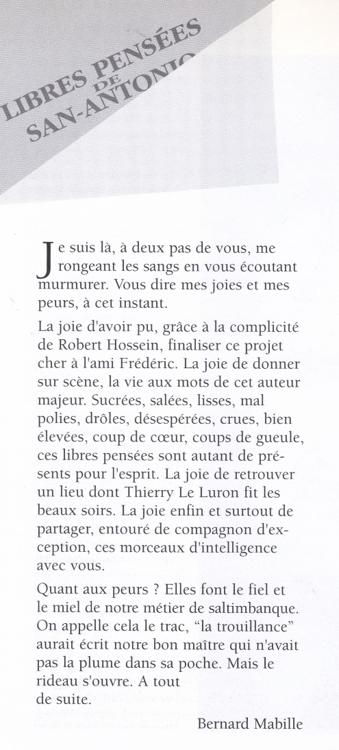 Ce programme de 44 pages de format 16,5 sur 24 cm présente la pièce de théâtre Libres pensées de San-Antonio dont la première représentation s’est tenue au Théâtre Marigny, salle Popesco, le 9 février 2001.