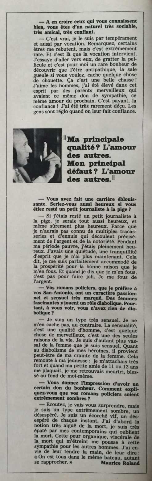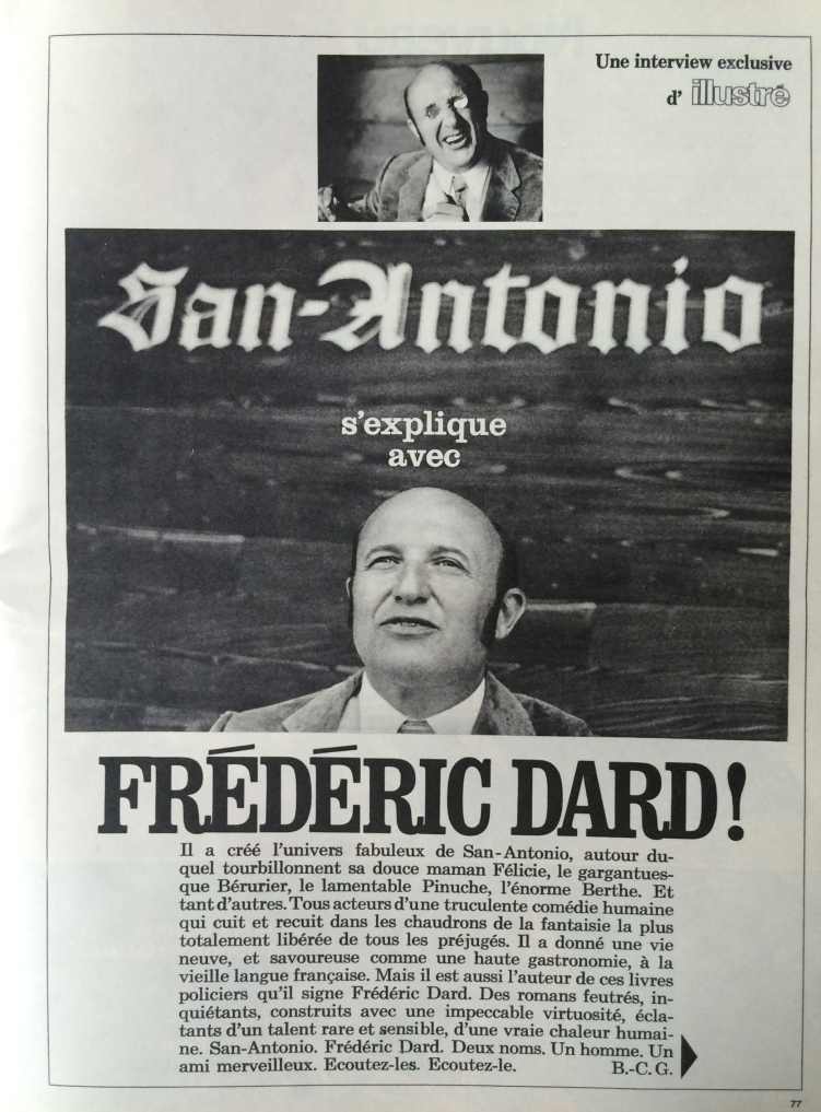 Ce numéro contient une interview de Frédéric Dard ayant pour thème « San-Antonio s’explique avec Frédéric Dard » qui a été réalisée par Maurice Roland . Elle porte sur la façon d’écrire des romans signés Dard et ceux signés San-Antonio et sur la carrière de Frédéric Dard.