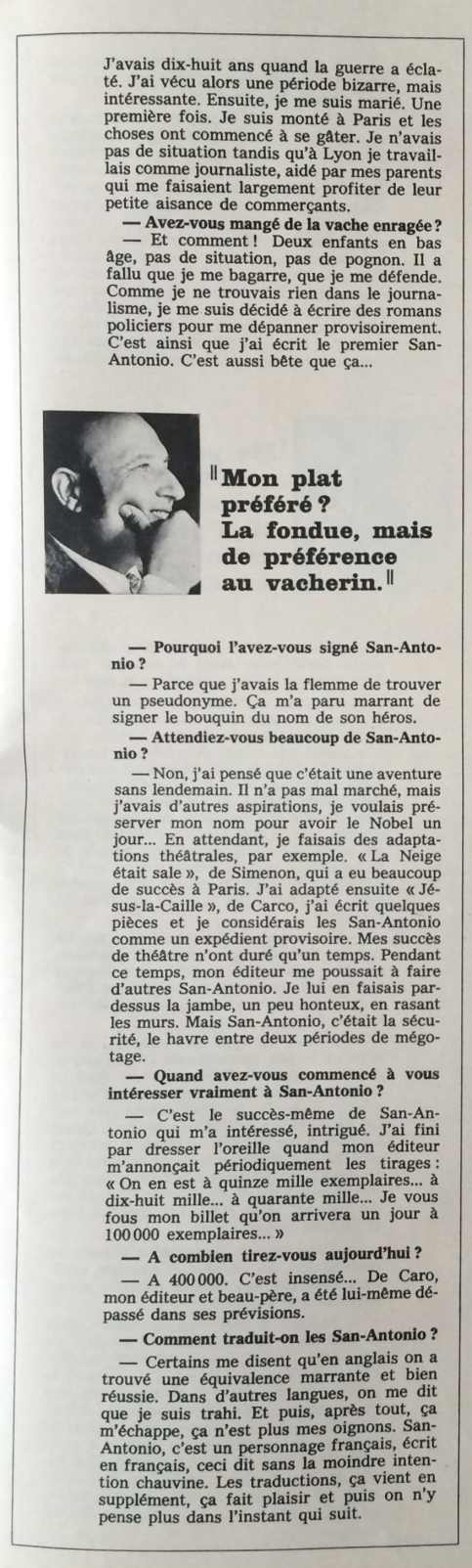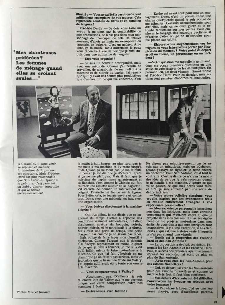 On trouve aussi dans ce numéro un article sur cet écrivain intitulé San-Antonio dans ses meubles. on y voit le décor dans lequel il vit, non pas à Fribourg, mais dans son chalet à Gstaad.