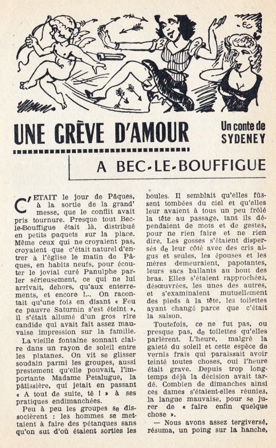 Ce numéro contient un conte intitulé « Une grève d’amour à Bec-le-Bouffigue » signé Sydeney, pseudonyme non reconnu de Frédéric Dard.