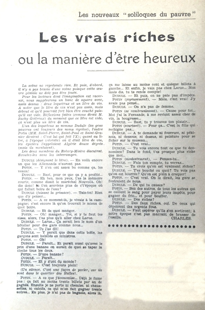 – Les vrais riches ou la manière d’être heureux, signé Charles, pseudonyme reconnu de Frédéric Dard