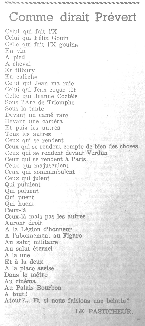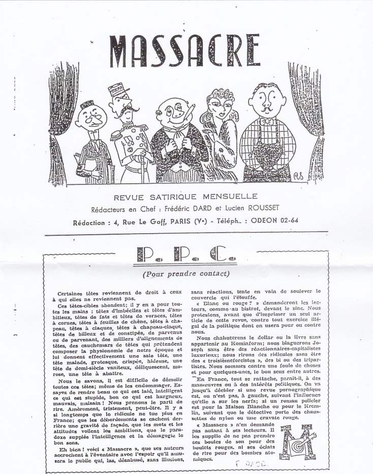 – Comme dirait Prévert, un poème signé le Pasticheur. On peut attribuer ce texte à Frédéric en le rapprochant de celui qu’il a écrit dans le Mois à Lyon n°13 du 15 novembre 1947 et qui est signé Jacques Prévert p.c.c. Frédéric Dard. On trouve dans ce dernier poème une ligne « Ceux qui Jean ma raie » à comparer à une ligne du poème de Massacre « Celui qui Jean ma raie ».