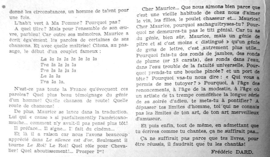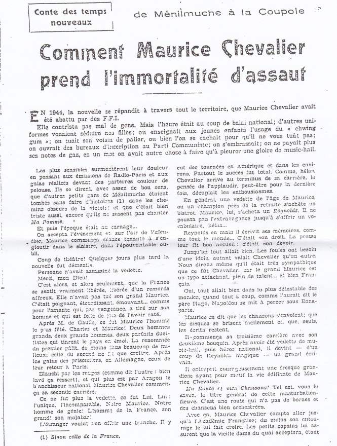 – Comment Maurice Chevalier prend l’immortalité d’assaut, un texte signé Frédéric Dard