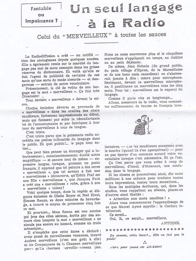 – Un seul langage à la radio, texte signé Antoine, pseudonyme reconnu de Frédéric Dard