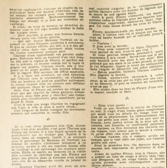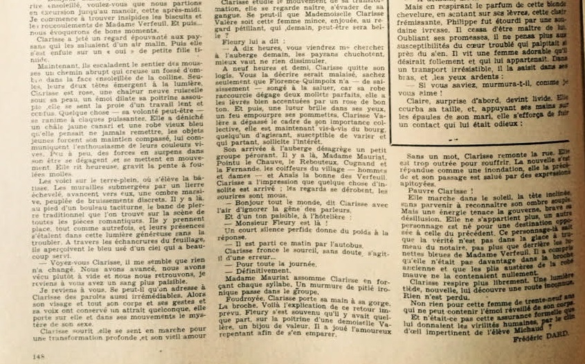 Clarisse Valère, un conte inédit de Frédéric Dard. Ce texte est présenté comme inédit, mais il a déjà été publié dans le journal Candide n°1013 du 25 août 1943 en tant que nouvelle inédite.En jouant sur les mots et puisque dans ce numéro de Mes lectures, il s’agit d’un conte et non pas d’une nouvelle, on peut le qualifier de conte inédit.