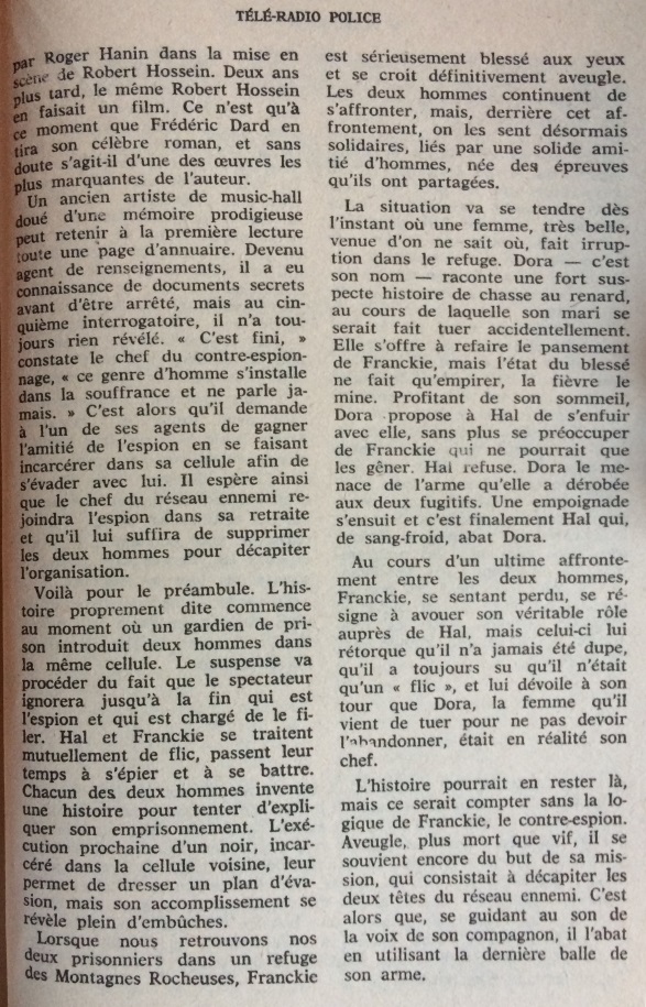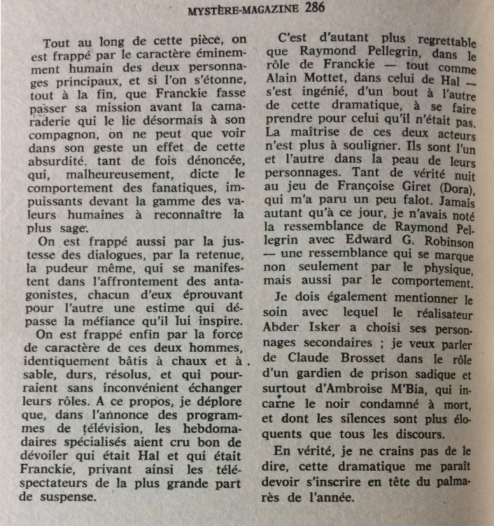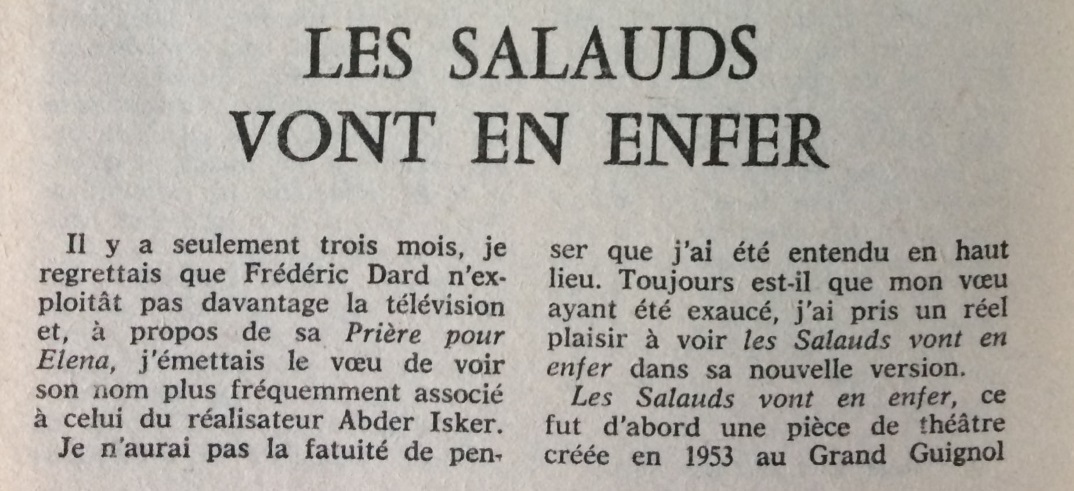 On trouve dans la rubrique Télé Police de Pierre Darcis une critique très élogieuse du téléfilm Les salauds vont en enfer réalisé par Abder Isker.