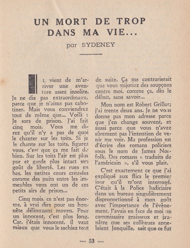 Un mort de trop dans ma vie , nouvelle de 9 pages signée Sydeney, pseudonyme non reconnu de Frédéric Dard.