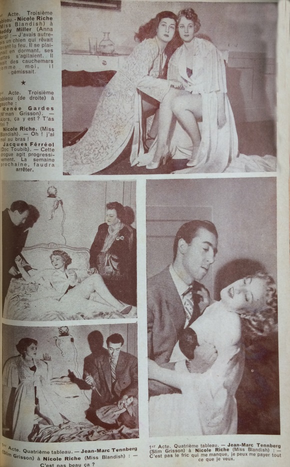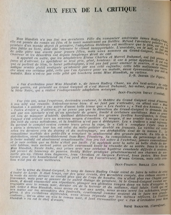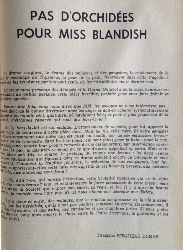 Ce numéro contient le texte intégral sur 37 pages de la pièce « Pas d’Orchidées pour Miss Blandish », créée au Théâtre du Grand-Guignol le 2 janvier 1950 dans une mise en scène d’Alexandre Dundas.