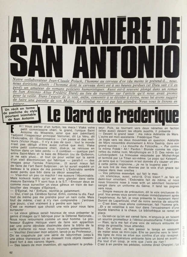 Ce mensuel de charme de 72 pages de format 21X29 vendu à 7F comporte un pastiche de San-Antonio écrit par Jean-Claude Polack dont vous avez l’intégralité ci-dessous.
