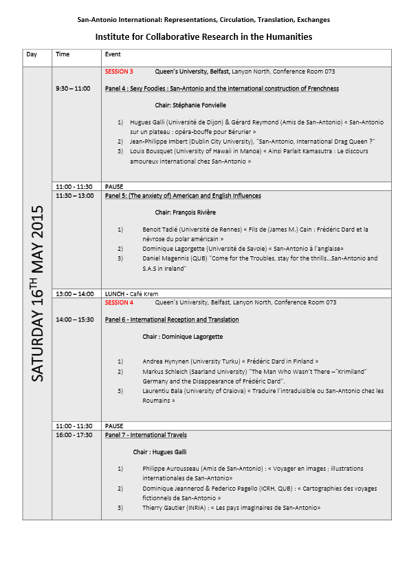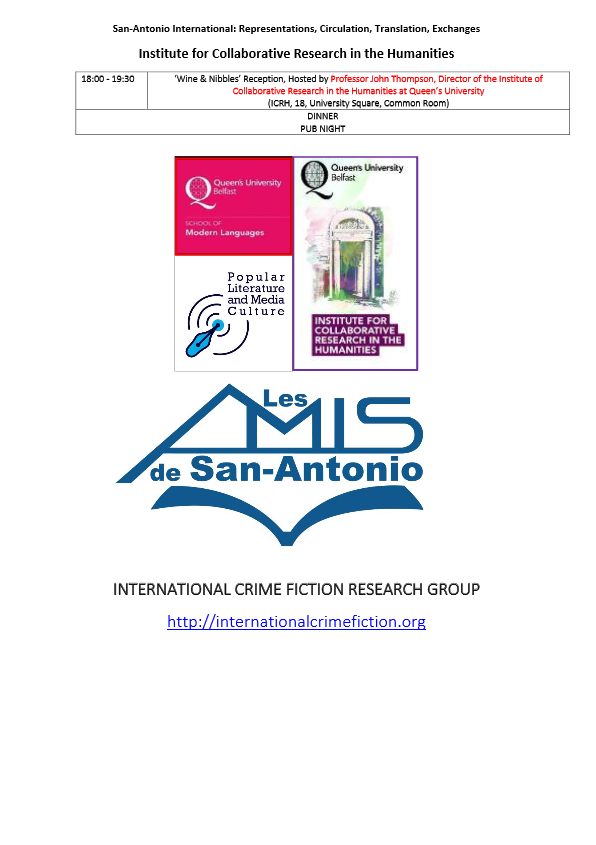 Ce colloque s’est tenu les 15 et 16 mai à Queen’s University Belfast où un grand amoureux et connaisseur de San-Antonio, Dominique Jeannerod, occupe les fonctions d’Examinations Office -Level 1 Coordinator and