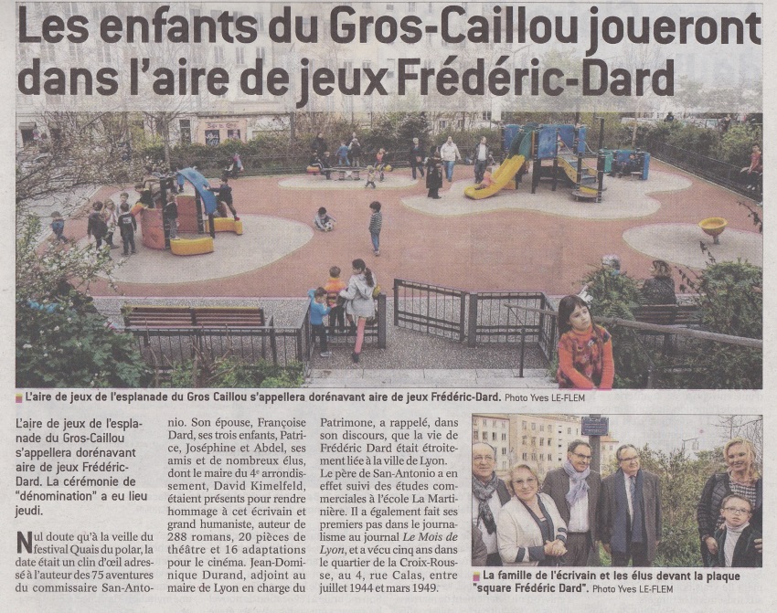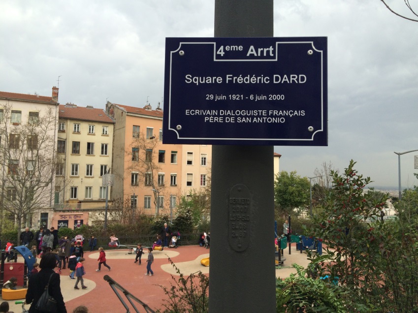 Le 31 mars 2016 vit l’inauguration du square Frédéric Dard dans le quartier de la Croix-Rousse qu’il avait beaucoup fréquenté lorsqu’il allait à la Martinière et lorsqu’il habitait avec Odette au 4, Rue Calas.