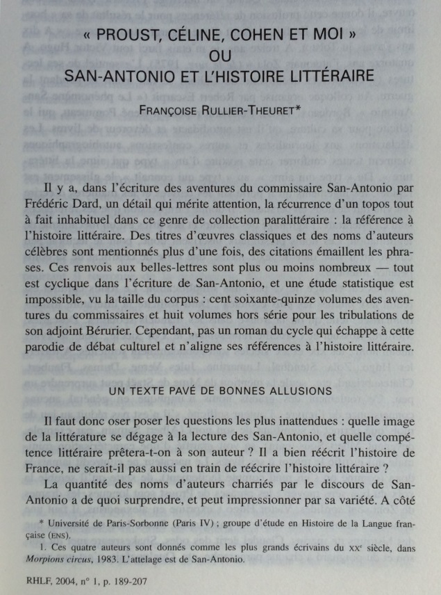Ce numéro contient un long article de 19 pages de Françoise Rullier-Theuret intitulé « Proust, Céline, Cohen et moi » ou San-Antonio et l’histoire littéraire.