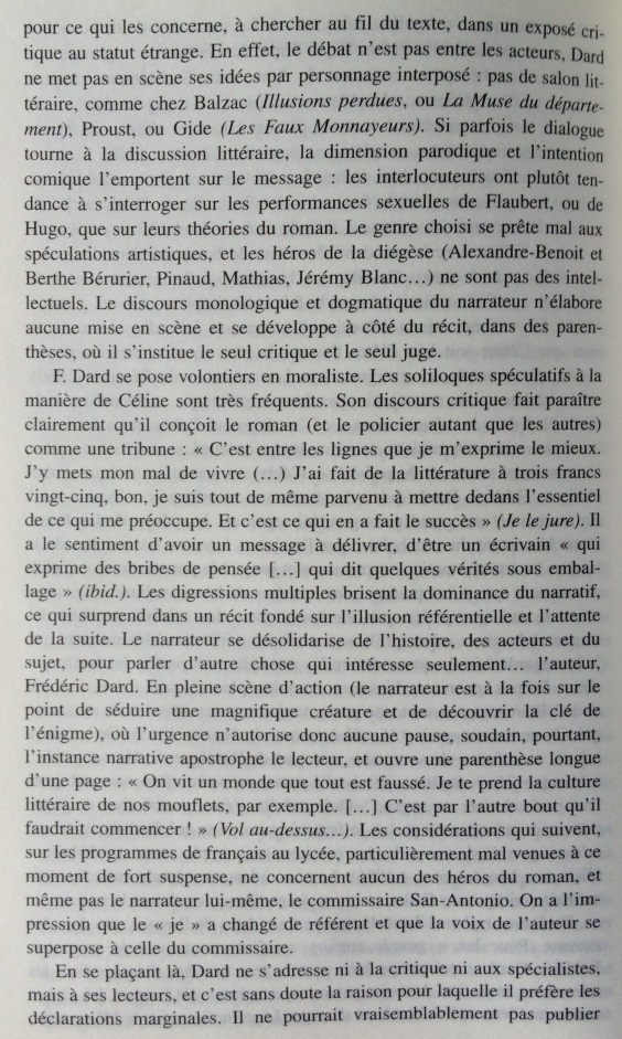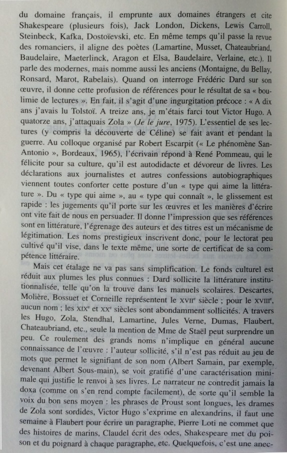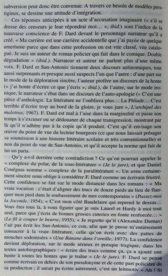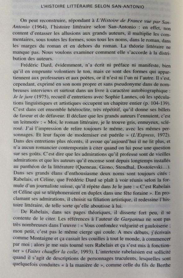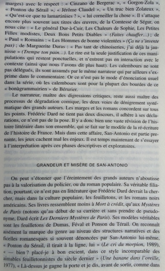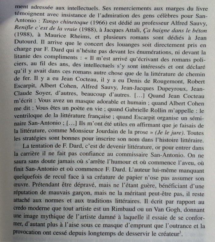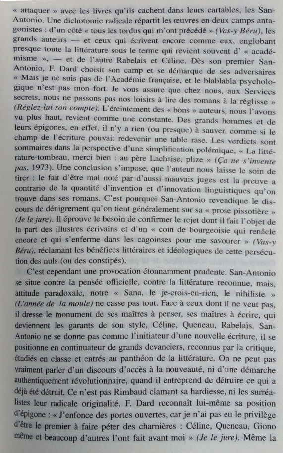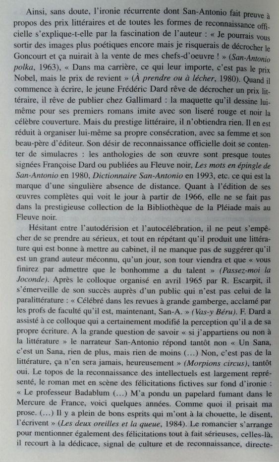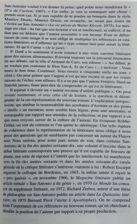 Le narrateur San-Antonio multiplie les références à l’histoire littéraire, donnant une très surprenante image de la littérature faite de stéréotypes, de bons sentiments, et d’allusions insistantes au nouveau roman. Cet écart par rapport à la pratique du roman populaire est si constant qu’il peut être considéré comme une marque de fabrique. Dans les marges des aventures de son héros-narrateur, Frédéric Dard développe une représentation simplifiée de l’histoire littéraire, avec d’un côté les ennuyeux, les académiciens et tous les grands auteurs, de l’autre Céline, Rabelais et lui-même. Derrière les pitreries stylistiques, on soupçonne vite que l’auteur ne peut s’empêcher de se prendre au sérieux. En construisant ce face-à-face entre le bouffon et l’académisme tourné en dérision, le narrateur cherche à se donner une filiation artistique et à s’inscrire dans le mythe des artistes maudits, c’est-à-dire à quitter l’espace de la paralittérature pour entrer en littérature. S’il s’efforce quelquefois de rivaliser de manipulations narratives avec le nouveau roman, ce n’est pas seulement pour rire, mais aussi pour prouver sa compétence en se confrontant aux avant-gardes. Cependant, sa démarche subversive se révèle convenue et s’abrite derrière des modèles prestigieux : derrière ces radicalisations comiques, se profile la silhouette d’un écrivain souffrant du complexe de la paralittérature, regrettant de n’avoir pu construire une œuvre reconnue, et espérant, sous sa posture de poète maudit, après avoir fait scandale, entrer un jour, comme Céline, dans l’histoire littéraire.