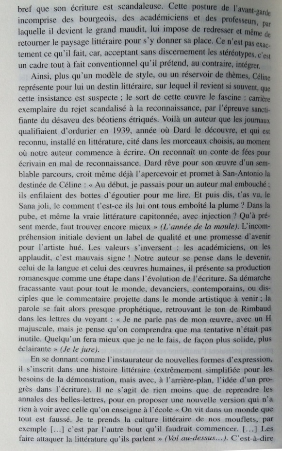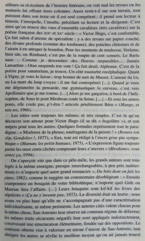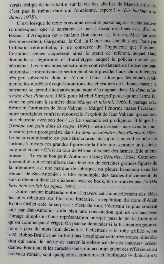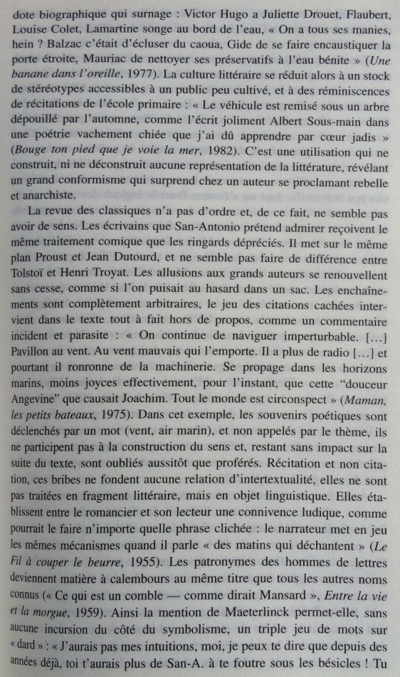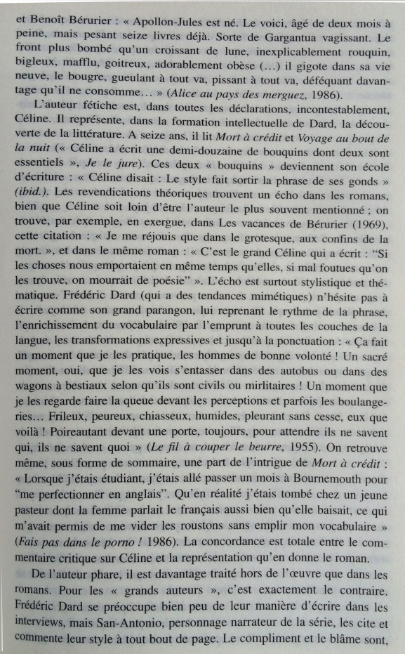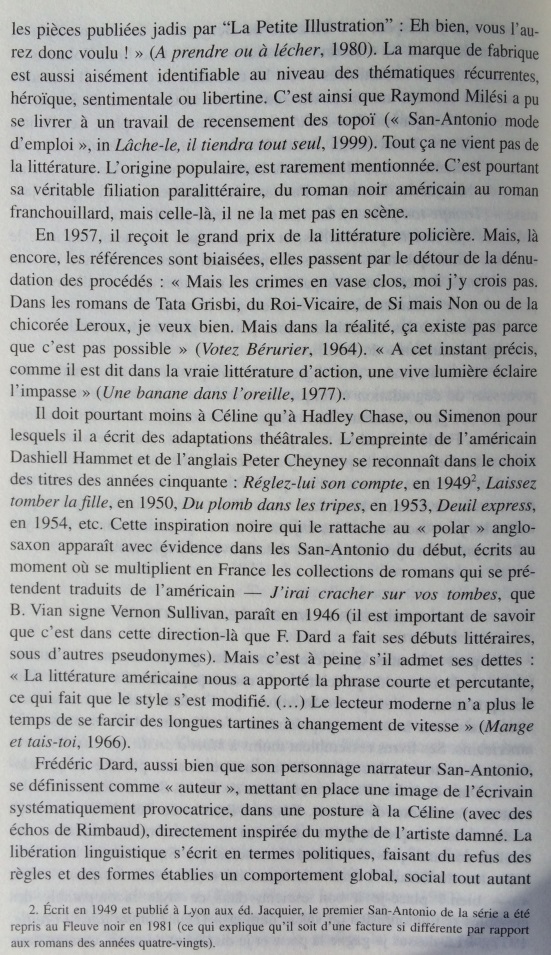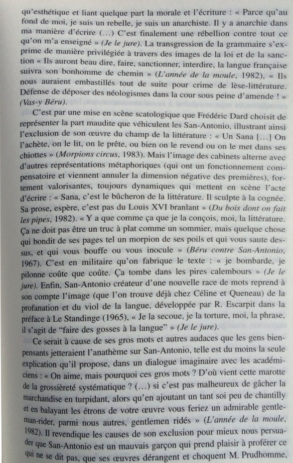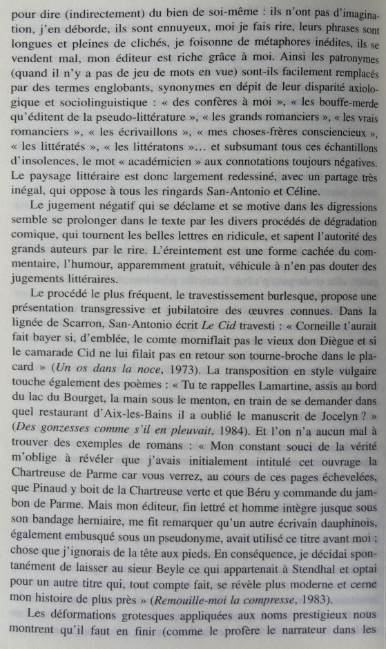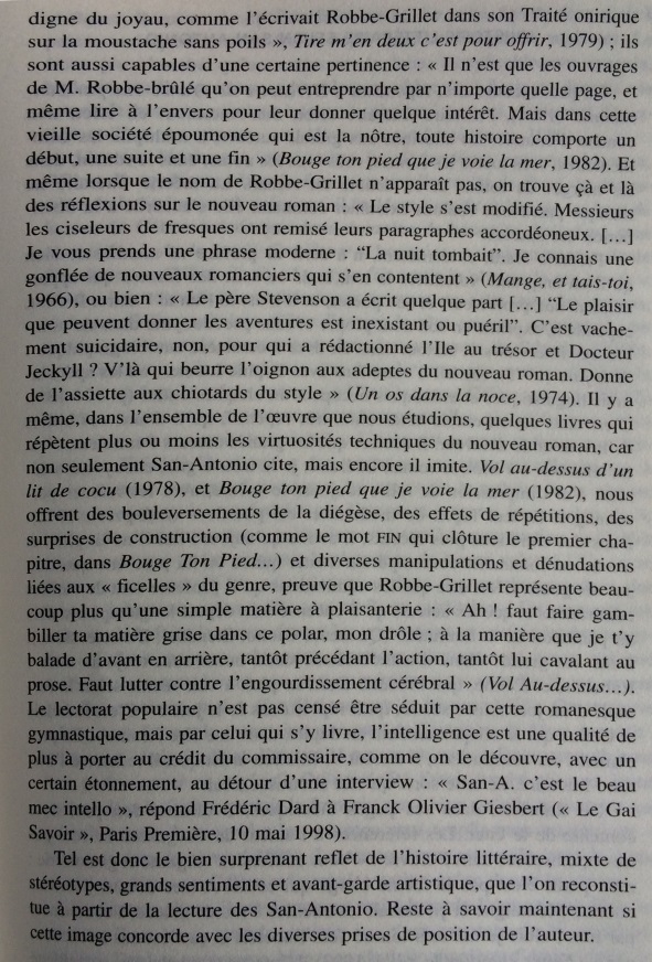 Le narrateur San-Antonio multiplie les références à l’histoire littéraire, donnant une très surprenante image de la littérature faite de stéréotypes, de bons sentiments, et d’allusions insistantes au nouveau roman. Cet écart par rapport à la pratique du roman populaire est si constant qu’il peut être considéré comme une marque de fabrique. Dans les marges des aventures de son héros-narrateur, Frédéric Dard développe une représentation simplifiée de l’histoire littéraire, avec d’un côté les ennuyeux, les académiciens et tous les grands auteurs, de l’autre Céline, Rabelais et lui-même. Derrière les pitreries stylistiques, on soupçonne vite que l’auteur ne peut s’empêcher de se prendre au sérieux. En construisant ce face-à-face entre le bouffon et l’académisme tourné en dérision, le narrateur cherche à se donner une filiation artistique et à s’inscrire dans le mythe des artistes maudits, c’est-à-dire à quitter l’espace de la paralittérature pour entrer en littérature. S’il s’efforce quelquefois de rivaliser de manipulations narratives avec le nouveau roman, ce n’est pas seulement pour rire, mais aussi pour prouver sa compétence en se confrontant aux avant-gardes. Cependant, sa démarche subversive se révèle convenue et s’abrite derrière des modèles prestigieux : derrière ces radicalisations comiques, se profile la silhouette d’un écrivain souffrant du complexe de la paralittérature, regrettant de n’avoir pu construire une œuvre reconnue, et espérant, sous sa posture de poète maudit, après avoir fait scandale, entrer un jour, comme Céline, dans l’histoire littéraire.