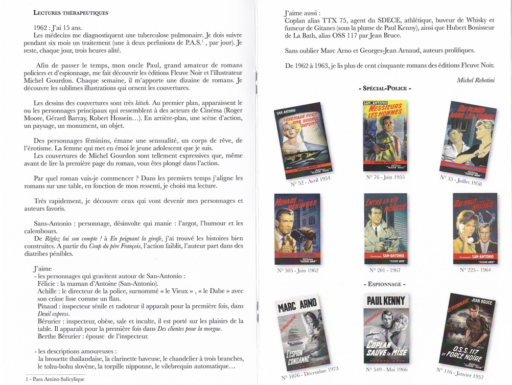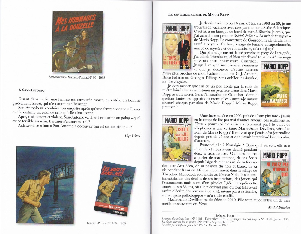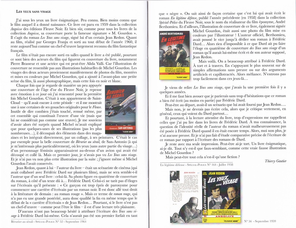 On y trouvera ainsi un éditorial de Patrick Bernard, Président de l’Association des Amis de Michel Gourdon et, entre autres, des textes de quelques amis de San-Antonio : Jean-Jacques Becuwe, amateur de contrepéteries qui intitule son texte « Goudron or not Gourdon », Jean-François Pribile qui se souvient de Tango chinetoque lu à 14 ans, Michel Gaboriau dit MG – comme Michel Gourdon-,Thierry Gautier qui nous parle du livre Les yeux sans visage, Didier Poiret, Michel Rebotini et Guy Wuest qui rend un hommage à San-Antonio.