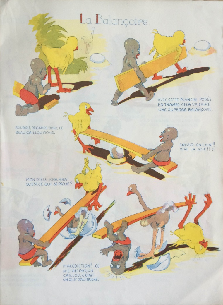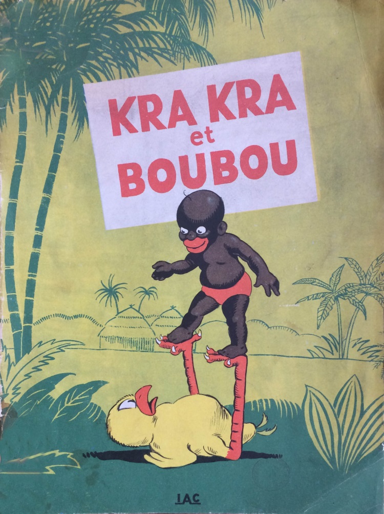 D’abord, avec Kra-Kra et Boubou, un livre de 16 pages publié chez IAC en 1942 racontant en histoires d’une page les péripéties d’un petit garçon noir Kra-Kra et d’un poussin Boubou.