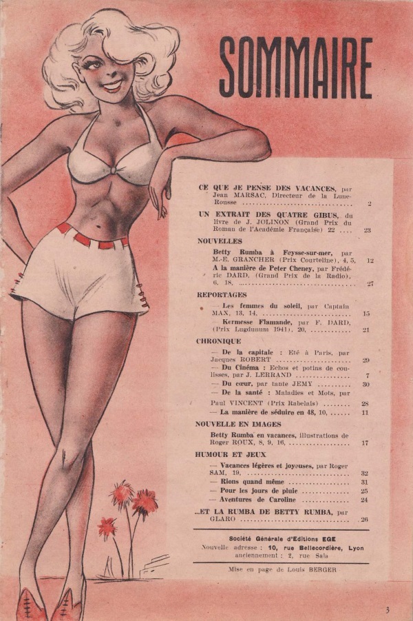 Dans le dernier numéro spécial été 48 de 32 pages, à coté de l’histoire Betty Rumba en vacances dessinée par Roger Roux, on trouvera des nouvelles de Frédéric Dard et des dessins de Roger Sam qui était aussi son ami.