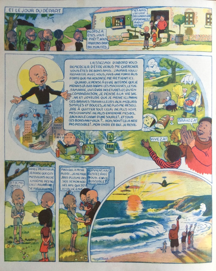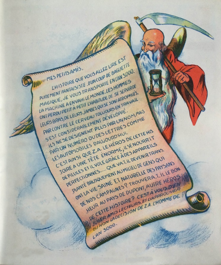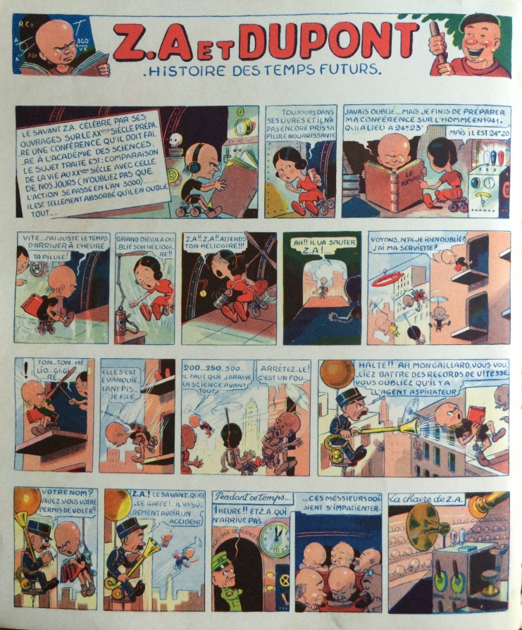 Puis ce sera, toujours chez IAC en 1943, Z.A et Dupont, histoire des temps futurs, une bande dessinée de 36 pages racontant l’histoire d’un savant Z.A. vivant en l’an 3000 qui revient vivre au XXème siècle dans le pays de Dupont, une campagne bien tranquille.