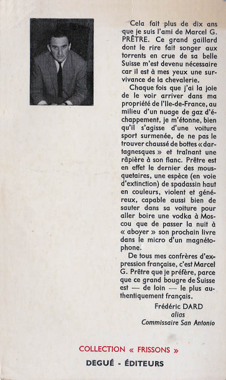 Le dernier plat comporte une photo de Marcel-G. Prêtre et un article élogieux de Frédéric Dard qui apprécie ce grand gaillard dont le rire fait songer aux torrents en crue de sa belle Suisse et qui est à ses yeux une survivance de la chevalerie