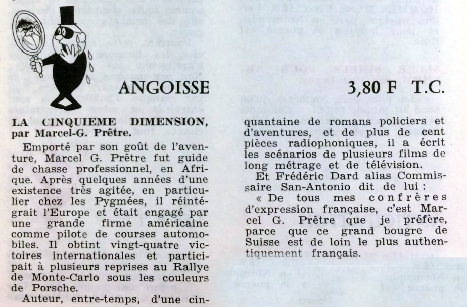 On trouve aussi dans ce numéro le texte de la dernière de couverture du roman de Marcel-G. Prêtre publié dans la collection Angoisse et ayant pour titre La cinquième dimension. Ce livre a très certainement été écrit (totalement ou partiellement) par Frédéric Dard.