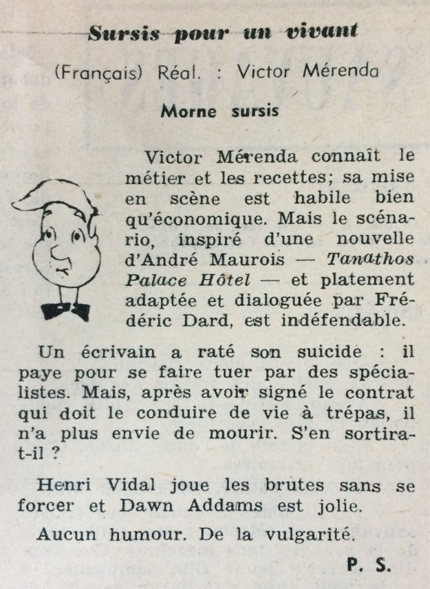 Ce numéro dont la première de couverture présente une photo de Marina Vlady contient, dans la rubrique Les films nouveaux, une critique sévère de l’adaptation et des dialogues écrits par Frédéric Dard pour le film de Victor Mérenda Sursis pour un vivant.